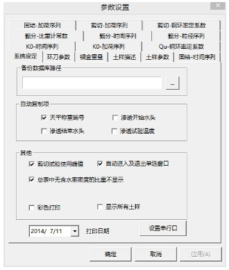 6)參數(shù)設(shè)置,包括環(huán)刀、鋁盒、土樣描述、固結(jié)、剪切、顆分、K0等一系列參數(shù)。