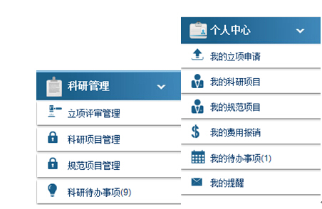 ◆科研管理&個人中心:為科研管理人員、技術(shù)委員會評審團、人事、財務(wù)提供的立項評審管理、科研項目管理、規(guī)范項目管理、科研費用管理、科研待辦事項。